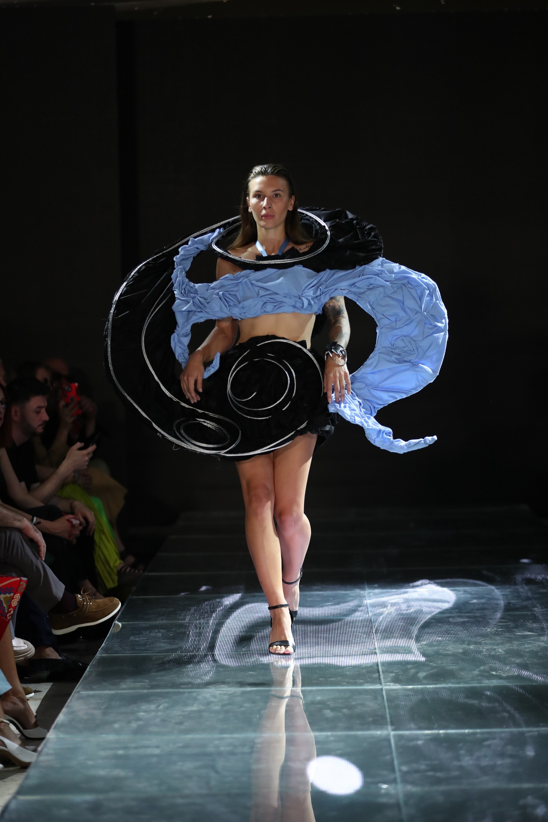 Nana Metajanyan, the visionary behind the esteemed brand Alenkie, showcased her exceptional talent in her upcycled collection. Employing a diverse range of techniques, Metajanyan breathed new life into old creations. One particular standout piece that captured everyone’s attention was the striking two-tone trench coat. Through the clever use of illustration and patchwork, the collection exuded a playful yet rebellious edge, making it a perfect fit for fashion-forward individuals who exude confidence. Sustainability was at the core of Metajanyan’s collection. To add a touch of ingenuity, models adorned headdresses constructed from pull tabs sourced from tinned drinks, further emphasizing the brand’s commitment to eco-consciousness.