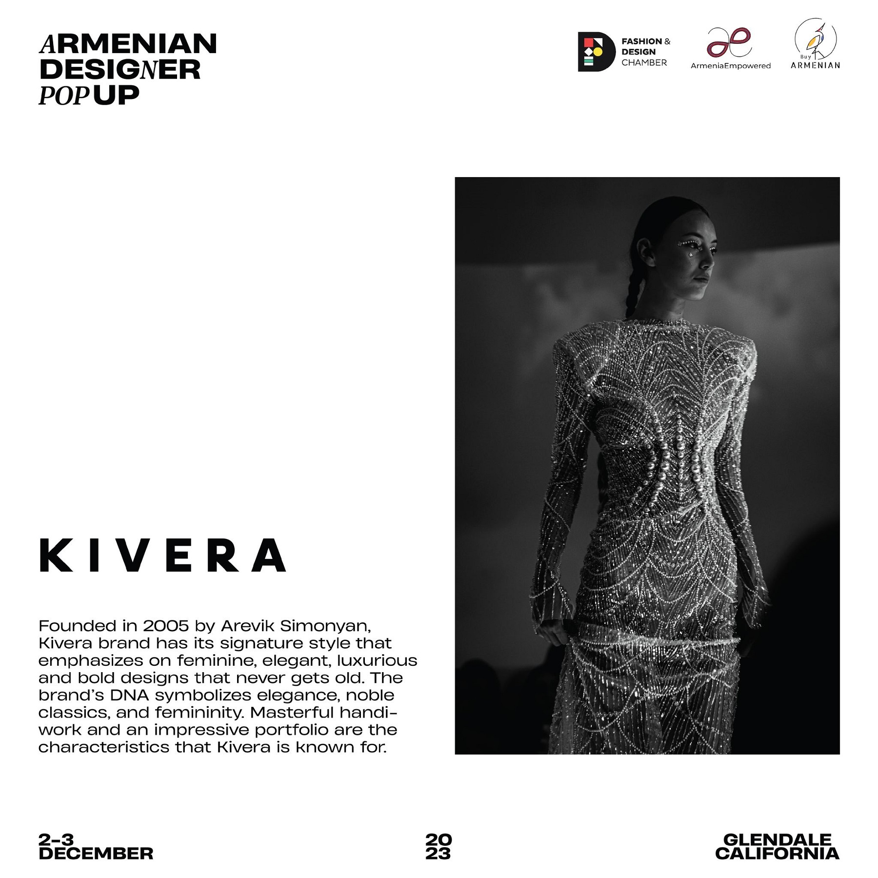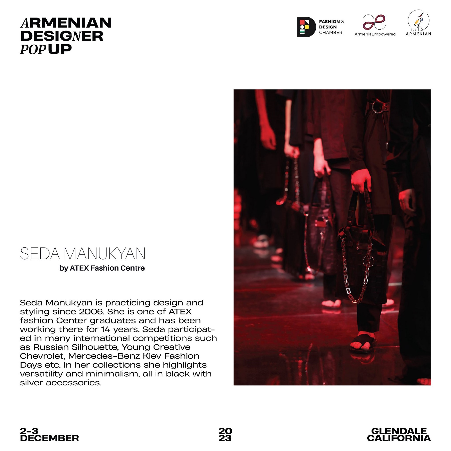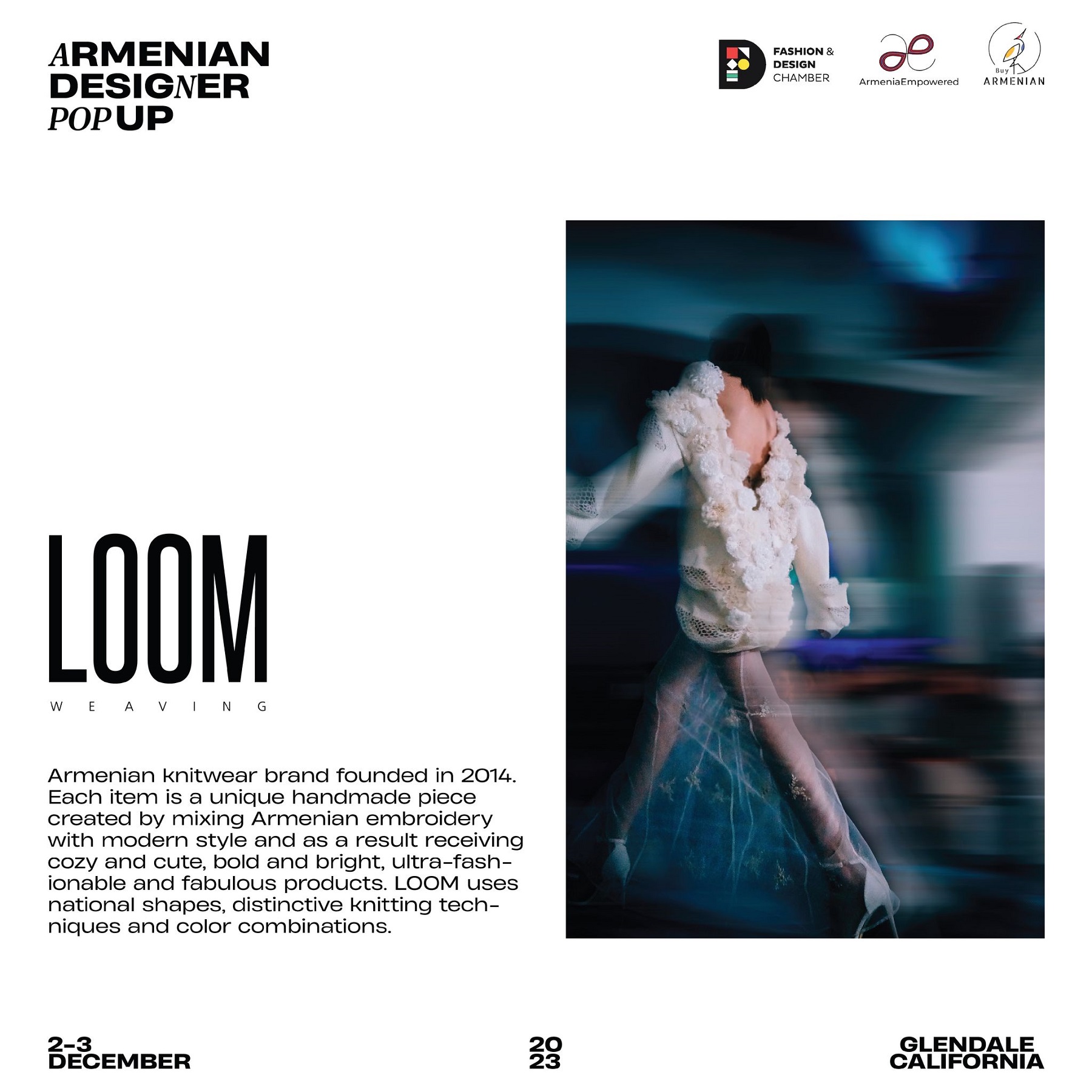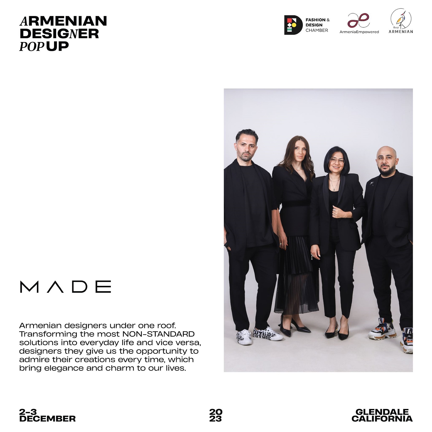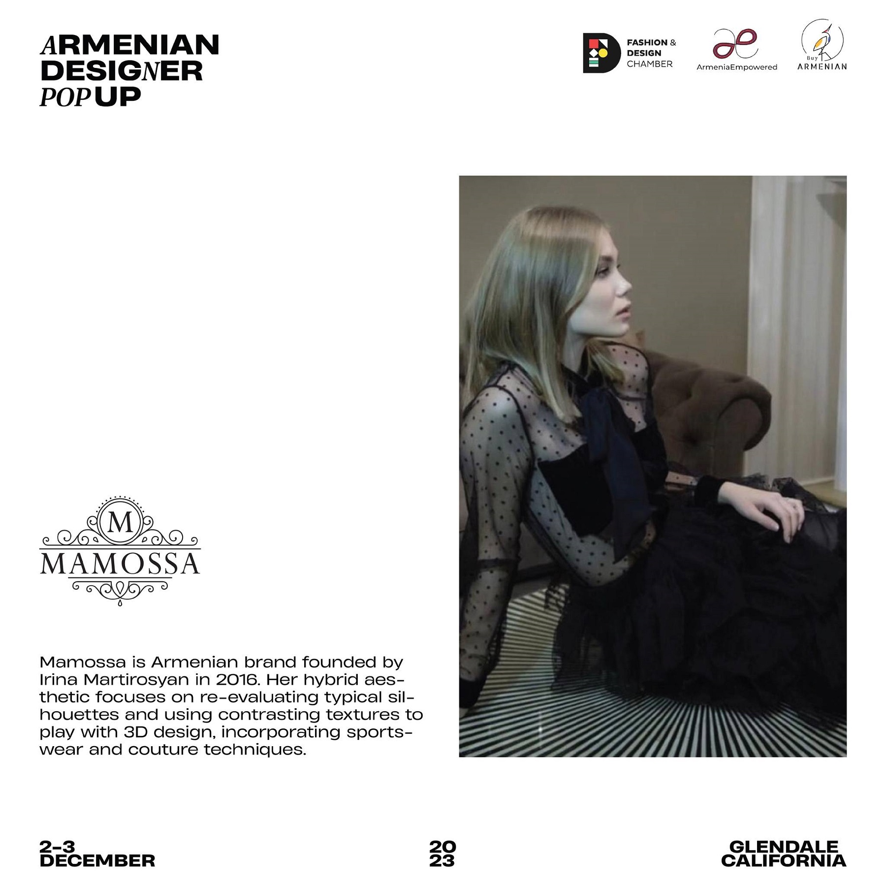 Armenian Fashion Takes Stage in the Heart of California! Date: December 2 & 3, 2023 Location: SOLAR STUDIOS, 3909 San Fernando Rd. Suite 114, Glendale, CA 91204. This event will bring together over 35 of Armenia's most talented designers. Meet your favorite designers and make unforgettable memories during weekend. Tickets are available here: https://www.eventbrite.com/.../armenian-designer-pop-up...