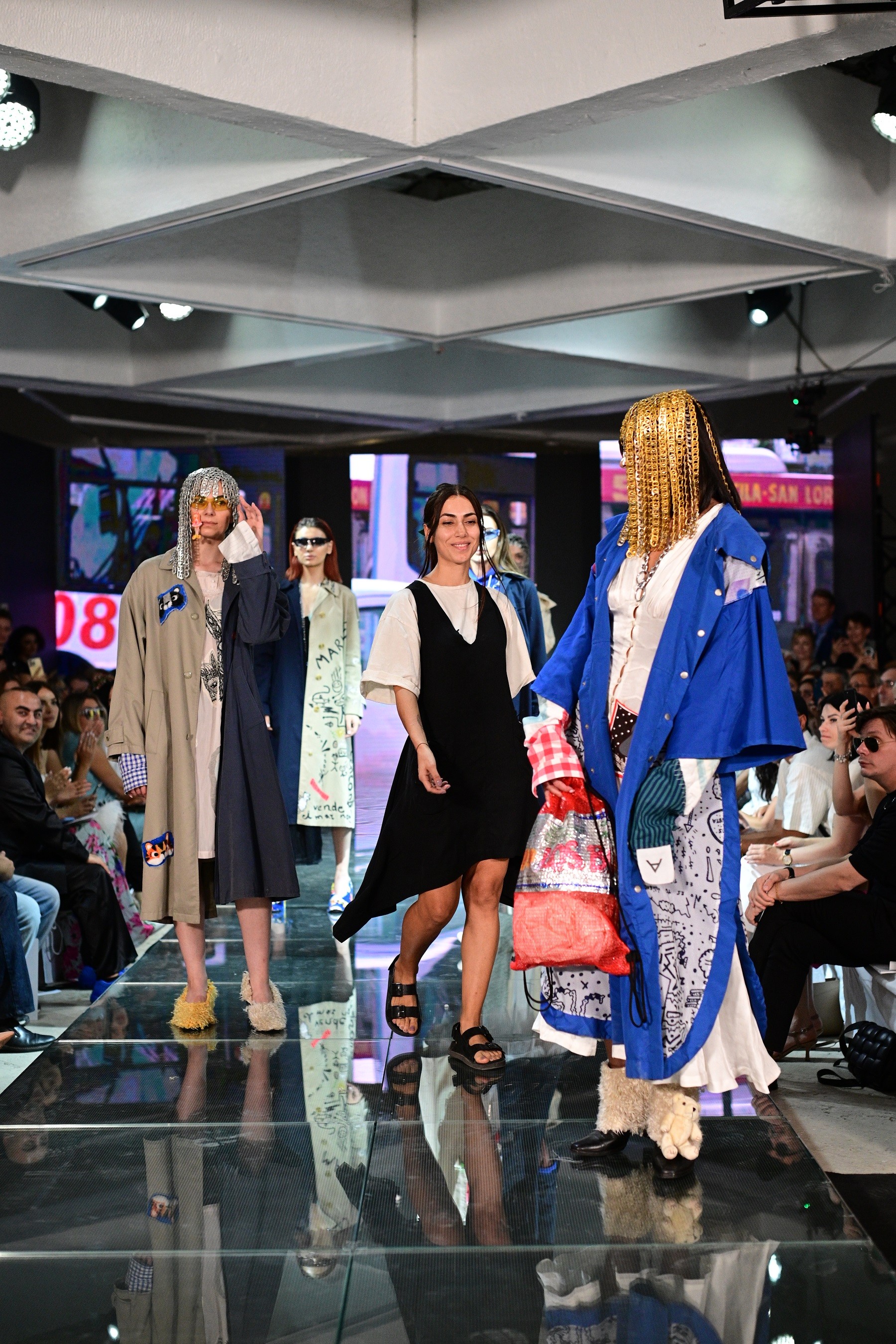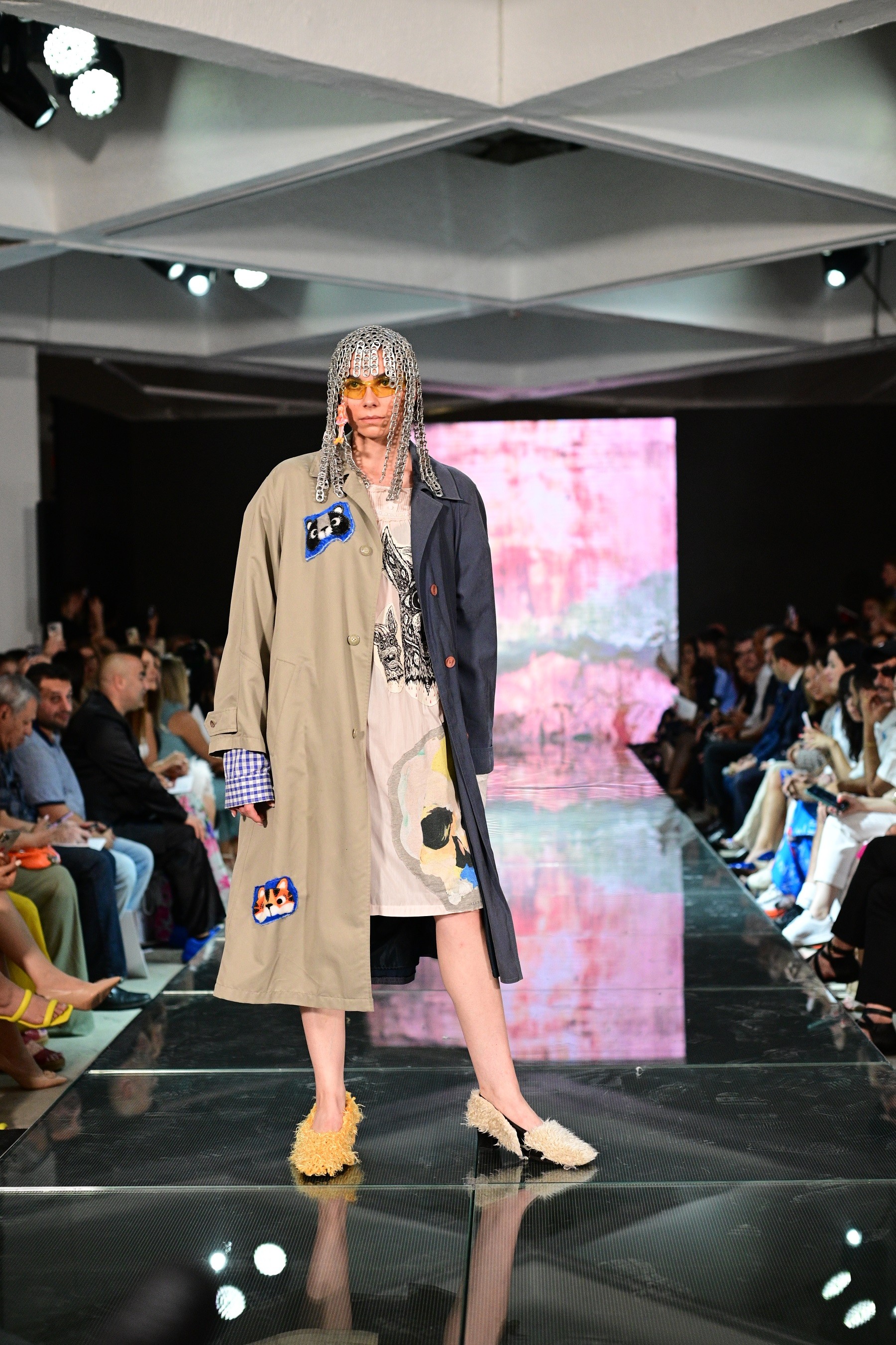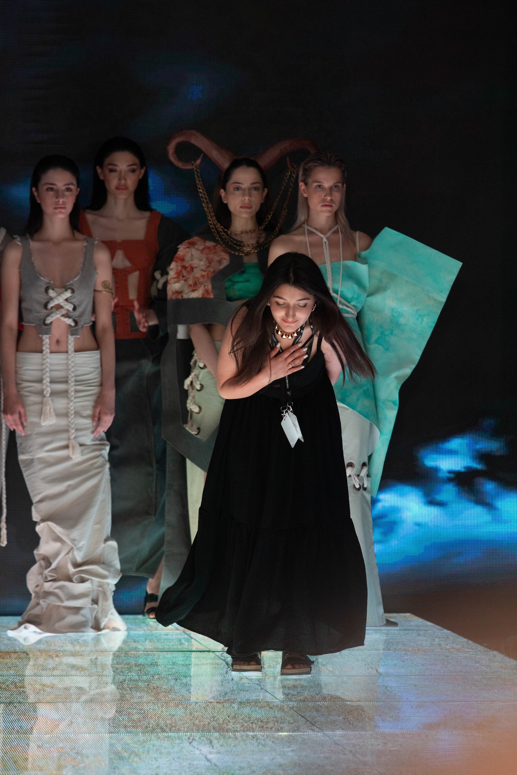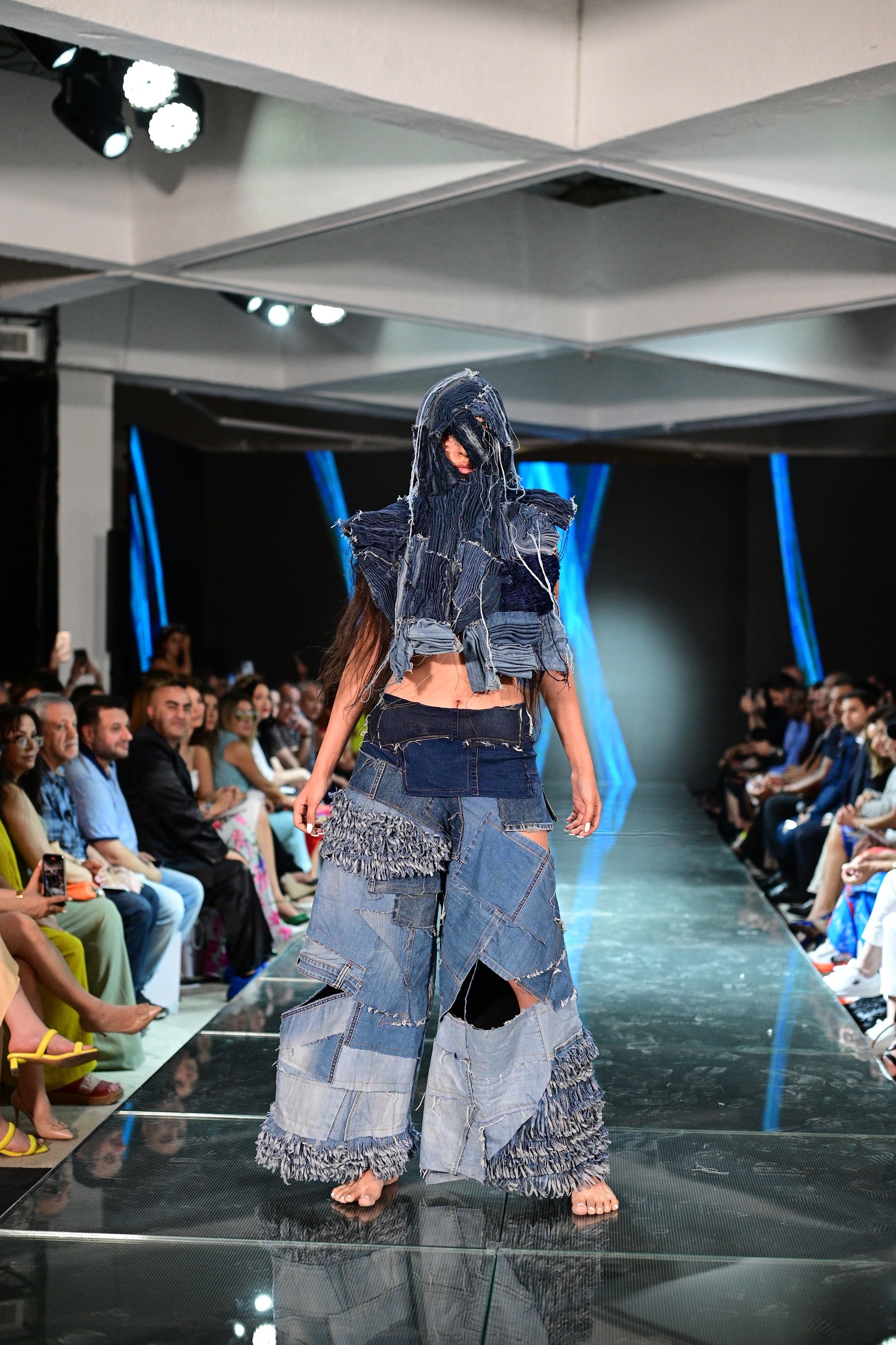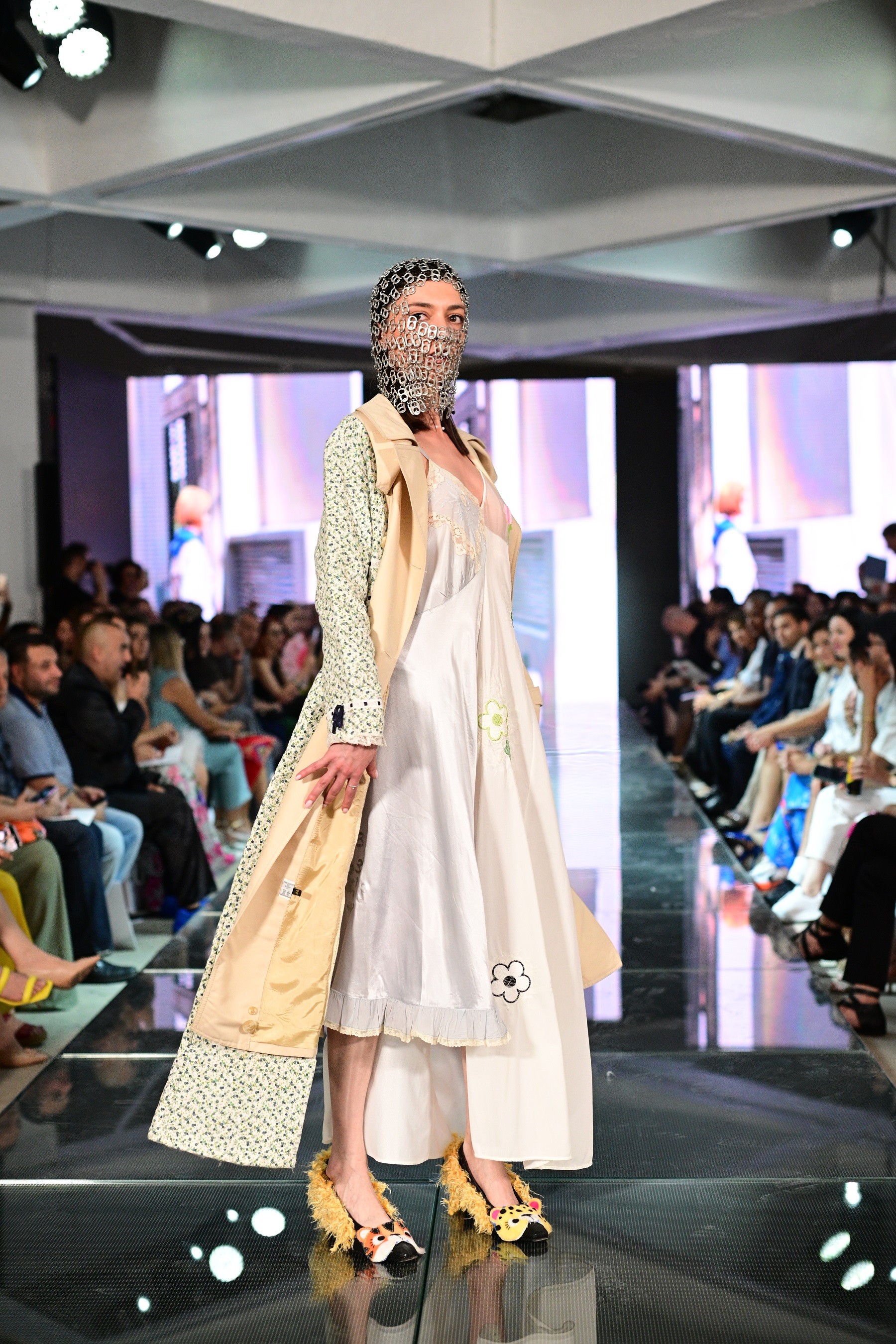 Nana Metajanyan, the visionary behind the esteemed brand Alenkie, showcased her exceptional talent in her upcycled collection. Employing a diverse range of techniques, Metajanyan breathed new life into old creations. One particular standout piece that captured everyone’s attention was the striking two-tone trench coat. Through the clever use of illustration and patchwork, the collection exuded a playful yet rebellious edge, making it a perfect fit for fashion-forward individuals who exude confidence. Sustainability was at the core of Metajanyan’s collection. To add a touch of ingenuity, models adorned headdresses constructed from pull tabs sourced from tinned drinks, further emphasizing the brand’s commitment to eco-consciousness.