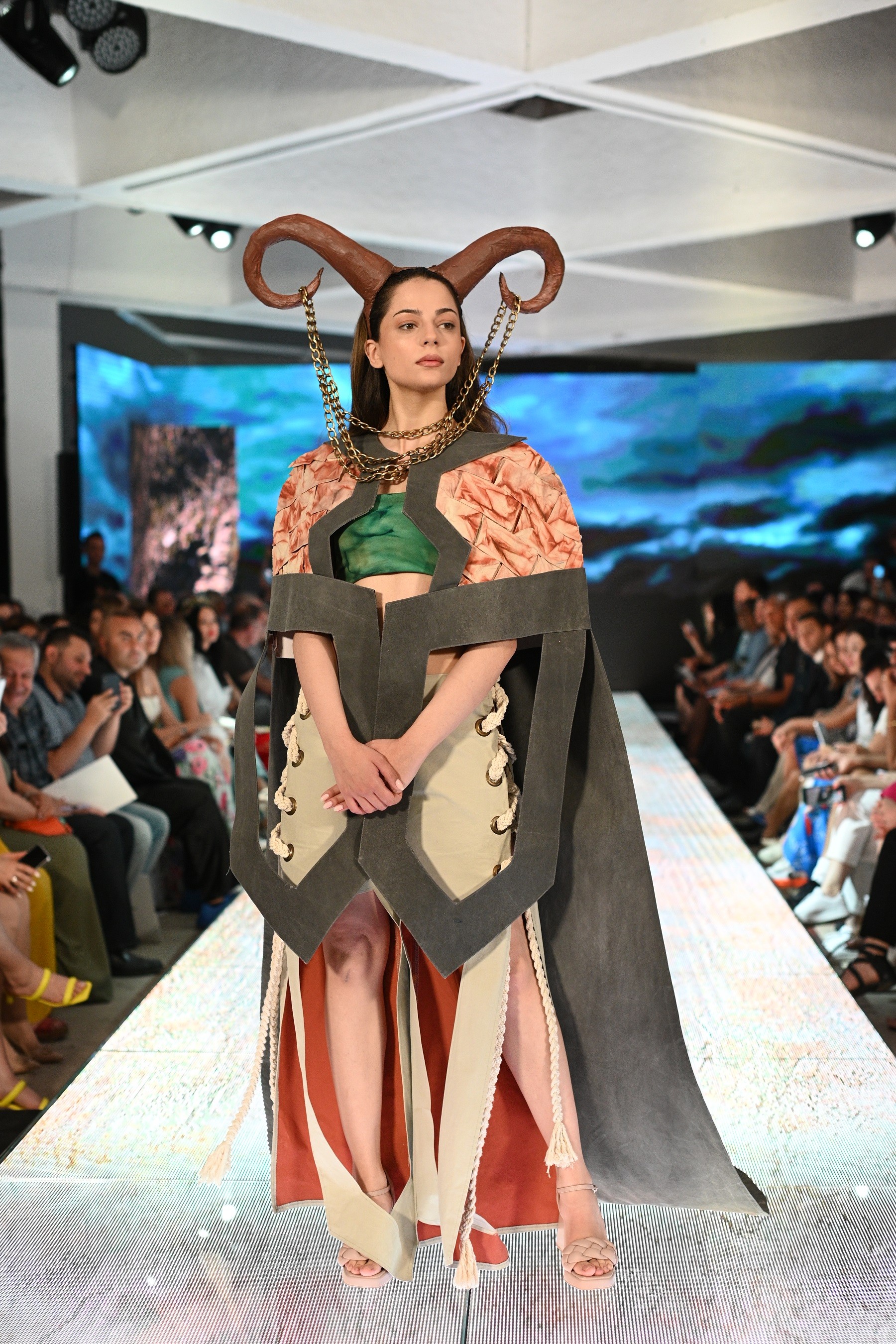 Mane Melikyan's MM2NINE’s “Lost Memory” collection drew inspiration from Armenia’s magnificent architectural legacy and the country’s traditional costume, the Taraz. This captivating collection transcended time, weaving a narrative that celebrated ancestral heritage while showcasing the prowess of modern craftsmanship. The inclusion of horned headpieces paid homage to the iconic Afrikyan’s Club Building, which once graced the heart of Yerevan. Through these striking elements, MM2NINE provocatively explored the intertwined nature of shared histories and the often-controversial removal of historic relics to pave the way for a dynamic and ever-evolving culture.